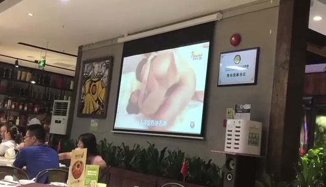 不知道的还以为这是什么攒劲小节目,某地中餐厅客流高峰期,本该在大屏幕展示的宣传视频不知道怎么就变成了成人AV,餐桌上的顾客看花了眼,餐厅的经理慌了神。
