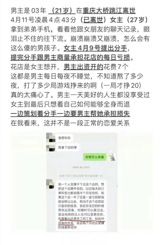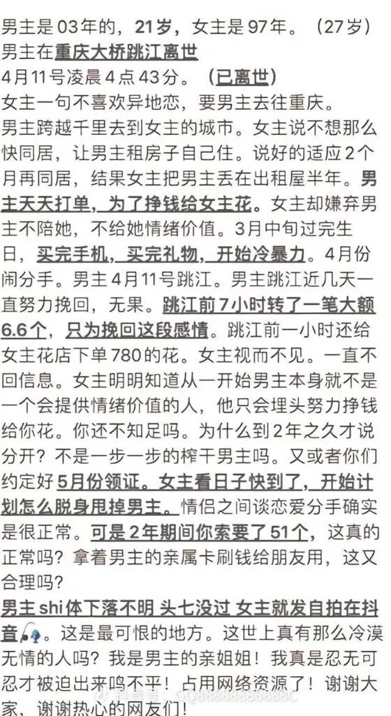 重庆21岁纯爱战士跳河胖猫自杀,女友谭竹竹否认花他51万