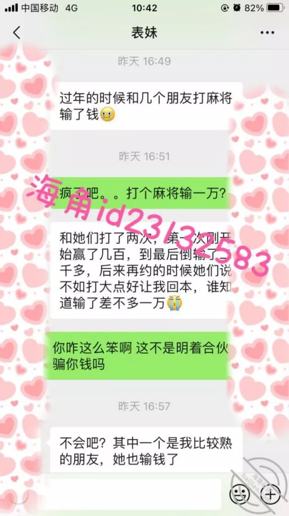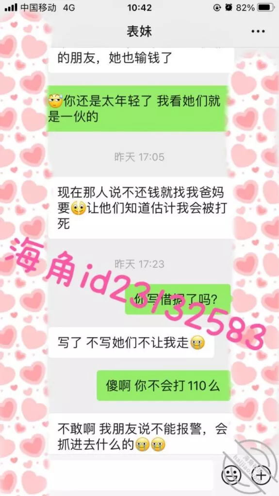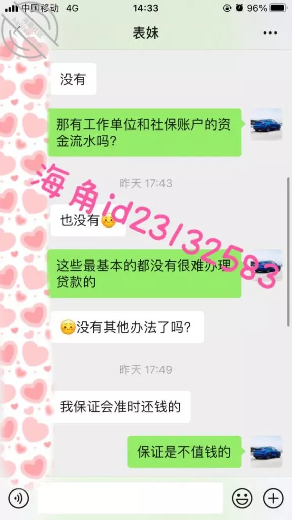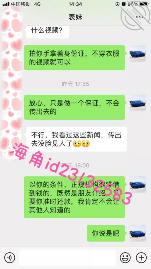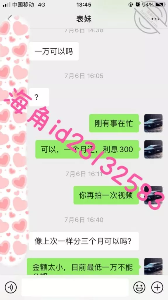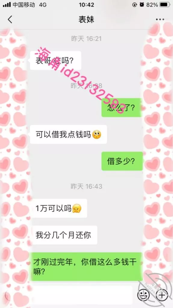 微信小号加了表妹之后她说想借1万,我问她有没有房子车子和工作社保,这属于明知故问让她跟着我的节奏走,然后引导她拍果贷视频给我,之后她就没有回复我了,希望她找不到其他人借钱吧