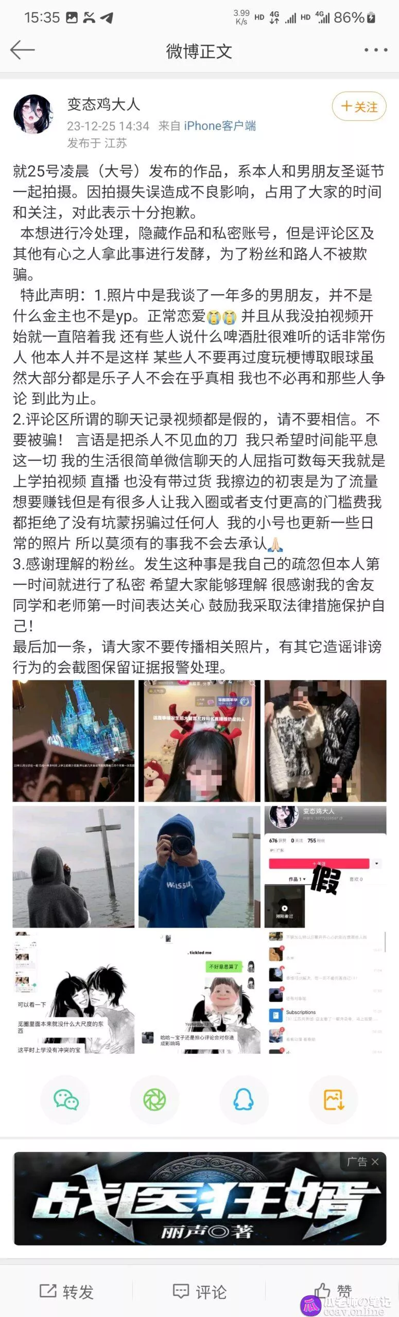 微博的辟谣公告,整个事件其实就是女主本人在抖音发布视图作品没有留意细节导致谣言起飞引发了一场吃瓜群众的狂欢,整件事翻到底也没有任何反差视频流出,瓜友们不要被收费发视频的给骗了哟