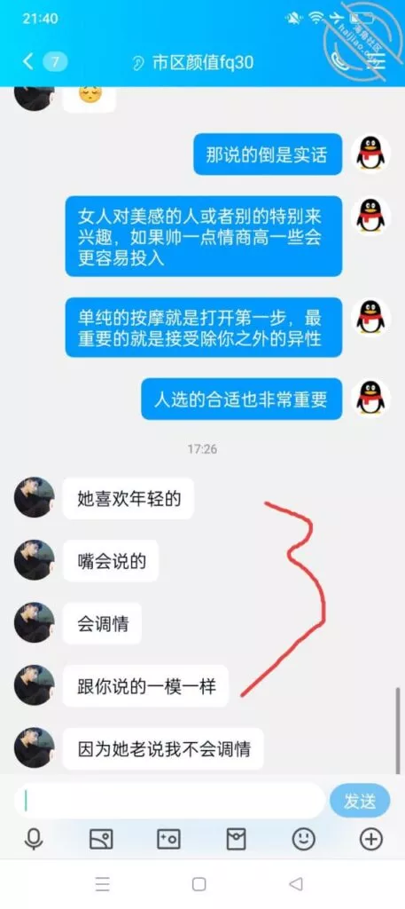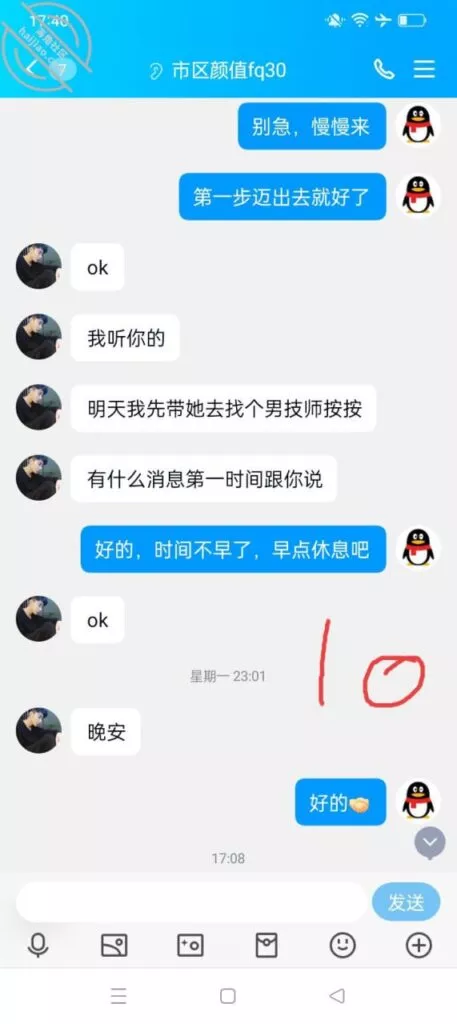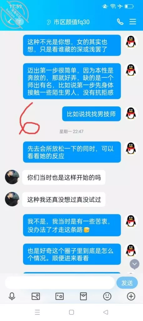 我也动了这份心思,群里找了个技师,找了几天没找到,不找的时候却发现群里有人发消息,这不是刚好随我心意。刚好这天下点雨阴天,我俩也没事,于是就预约了一个