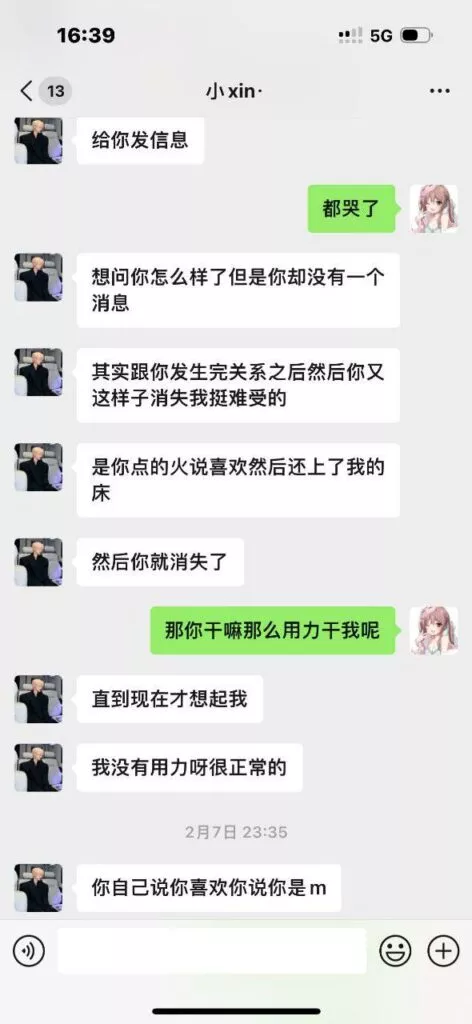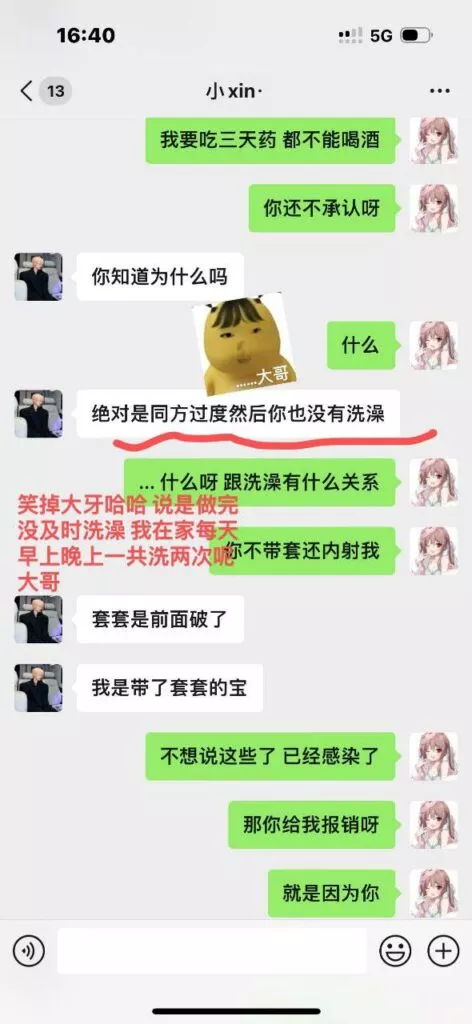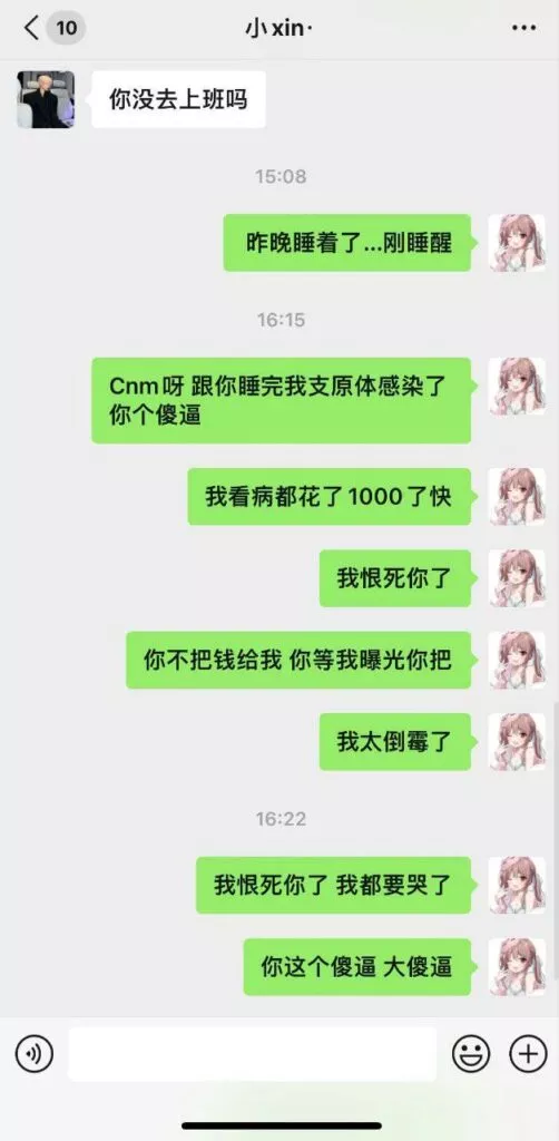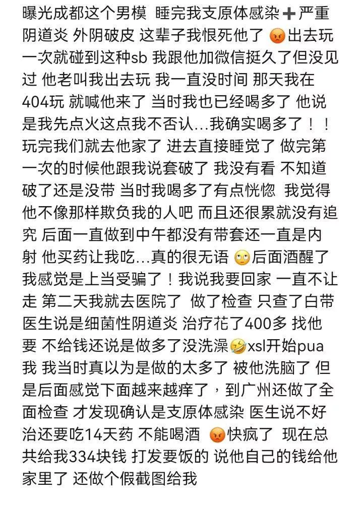 四川小仙女酒吧的约会经历,让她联系上了一位自称实习生的帅气男模,两人相识已有两年半。一次酒后冲动,令她陷入了人生最大的黑历史——竟不慎感染了性病。令人意外的是,该男模不仅没有表示歉意,反而吐槽她的问题,令她怒火中烧,最终决定曝光男模,以此为自己讨回公道。