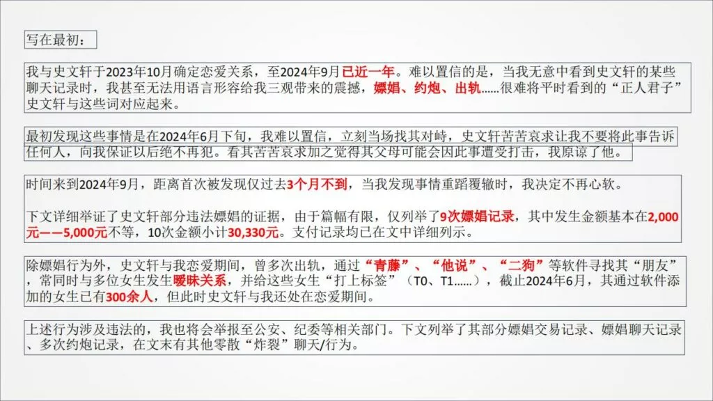 这篇长达58页的PPT揭示了招商银行管培生史文轩与其女友之间的种种问题,内容详细而深刻,令人震惊。女友亲自出面揭露了其在恋爱期间的种种不端行为,包括嫖娼成瘾与多次出轨。这段痛苦的经历不仅展示了她的心碎与失望,更引发对感情信任与道德底线的深思。