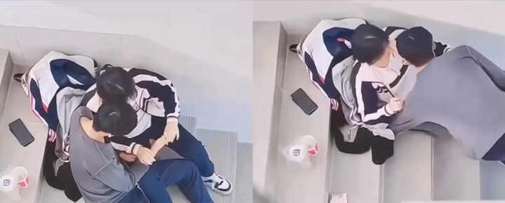 广州某职业院校在校生情侣教学楼楼梯doi被校友全程观摩